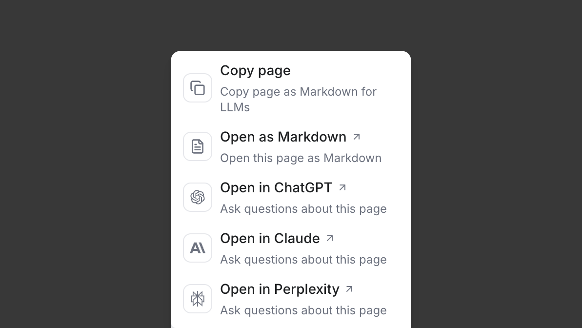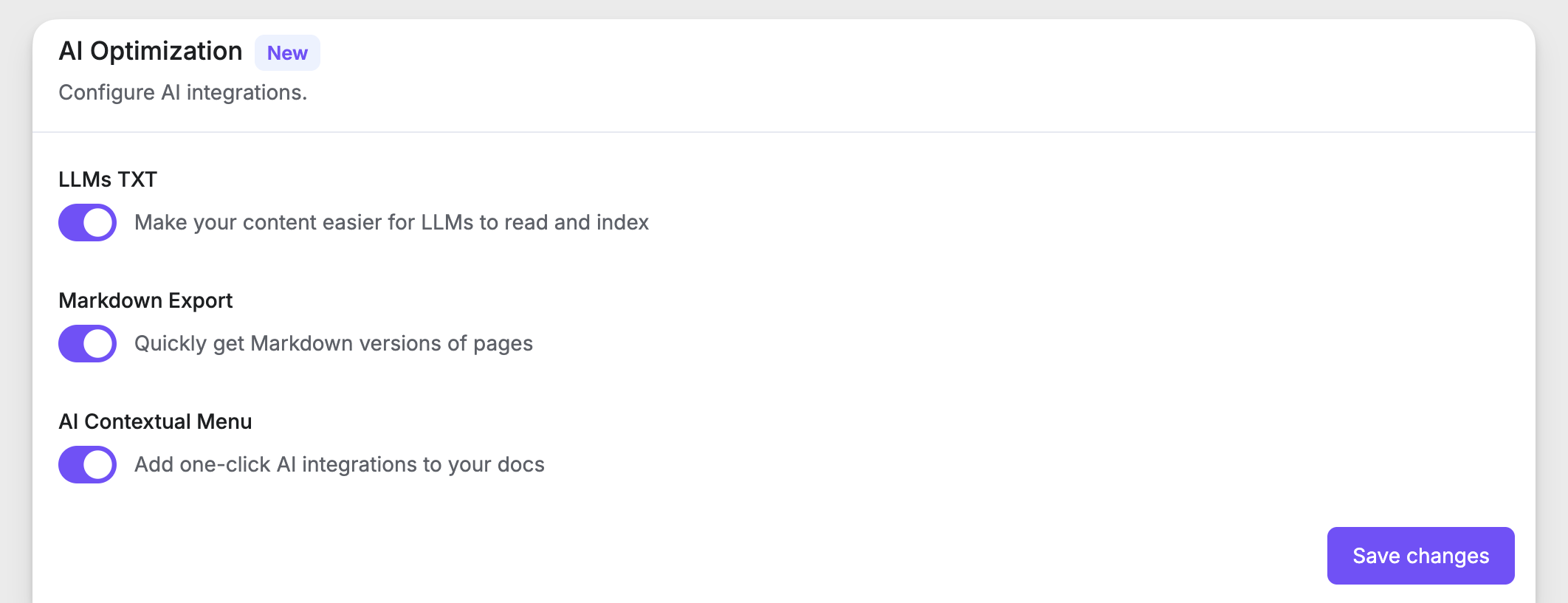 • AI Contextual Menu: Add one-click AI integrations to your docs