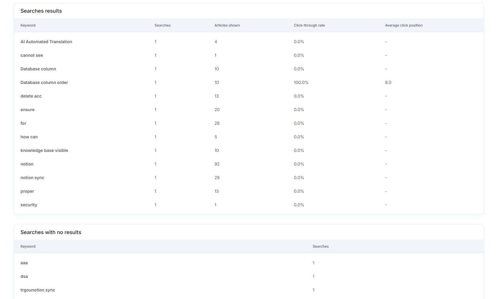 Search terms : See what users are searching for and whether your current articles cover those topics. If users frequently search for something that doesn't exist, it's a sign to create new content.
