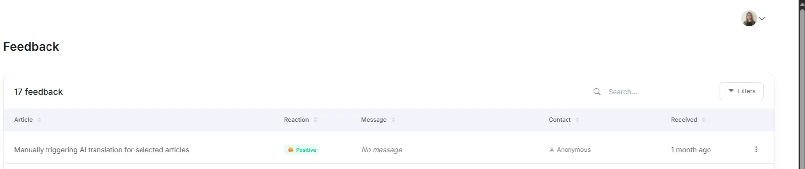 Reader feedback : Every reaction is tracked and tied to its article. You can see what users clicked ("Helpful," "Confusing," "Disappointed") and read any comments they left. This helps you understand how people feel about your content, not just how they use it.