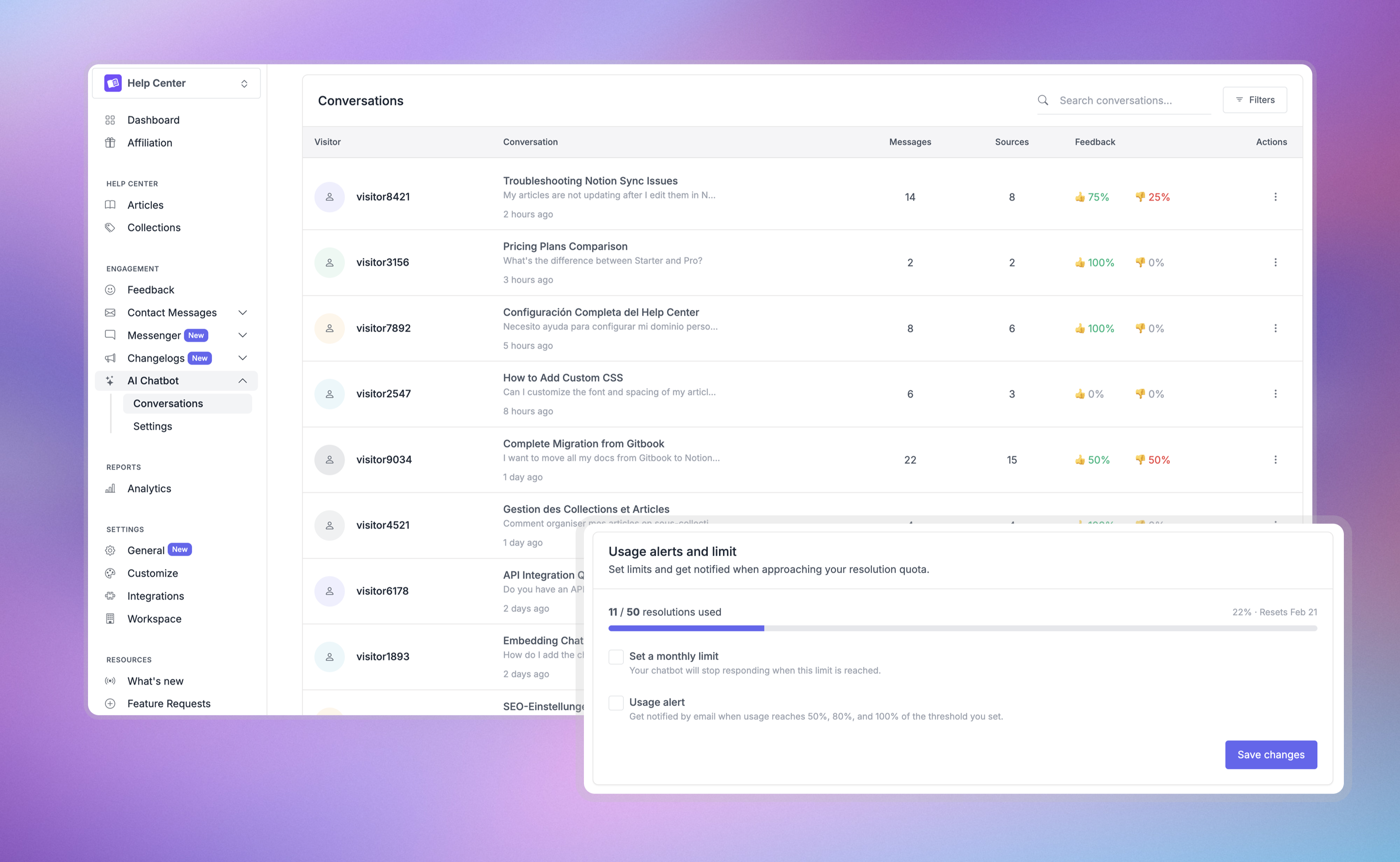 AI Chatbot now uses per-resolution pricing. You're only charged when the chatbot actually resolves a visitor's question, not for every message or failed attempt. Each resolution costs $0.49, and every plan includes 30 free resolutions per month. Set a monthly cap to stay in control of your spending.