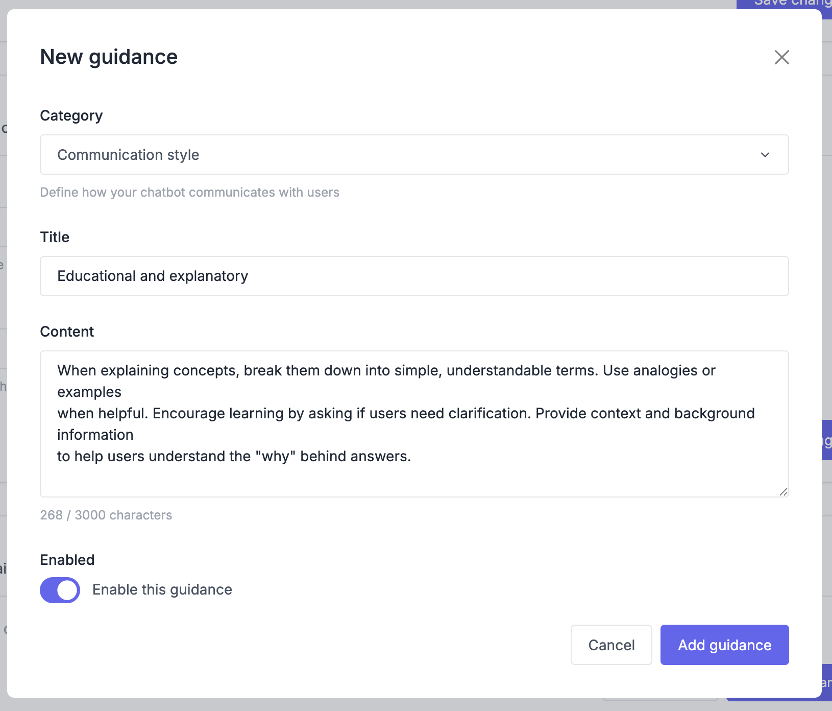 When a customer asks a question, the chatbot evaluates all your enabled guidances and applies any that are relevant. You don't need to set up triggers or conditions, the chatbot understands natural language and figures out when each guidance applies.