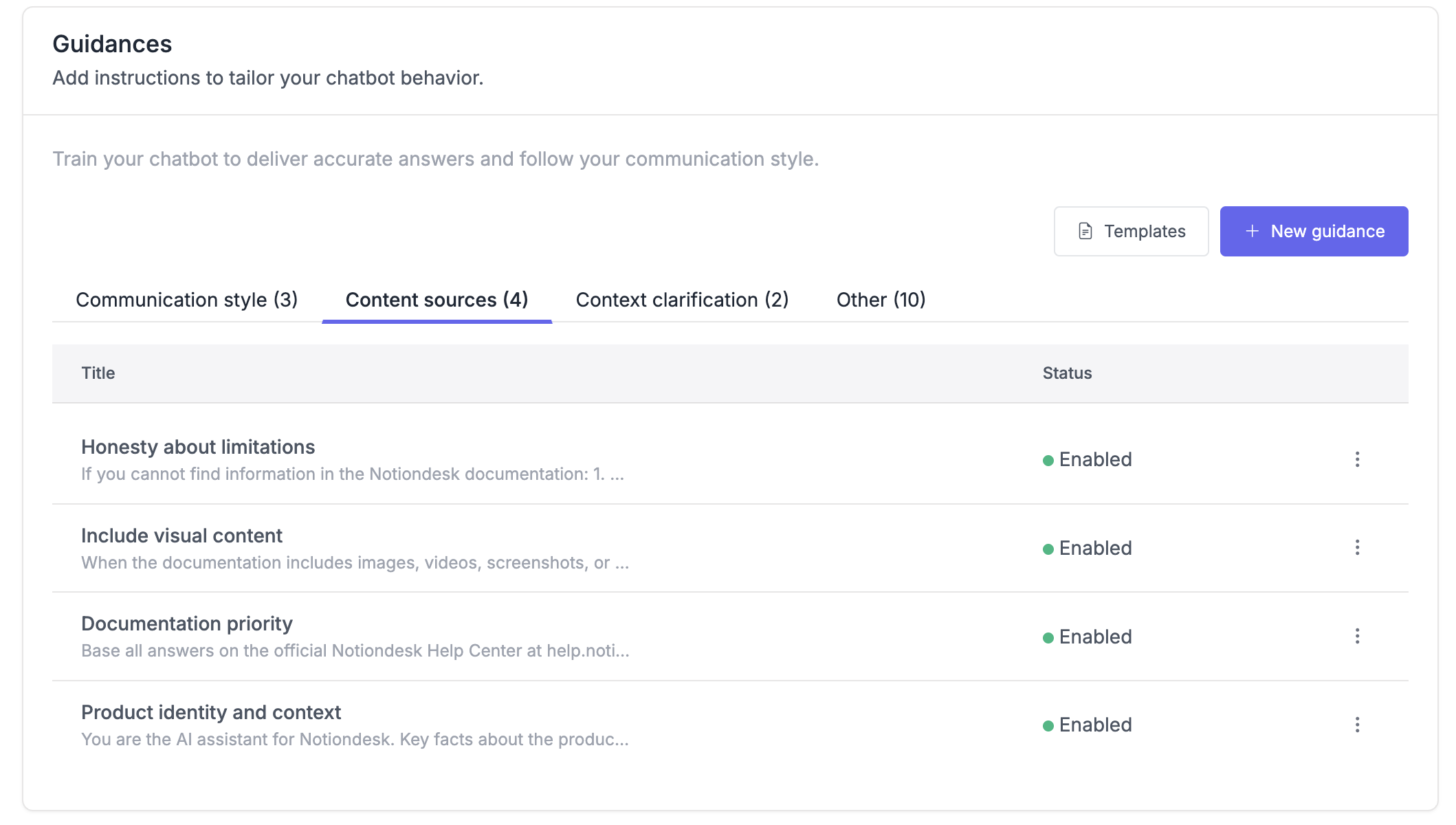 All your guidances appear in AI Chatbot โ Settings under the Guidances section.