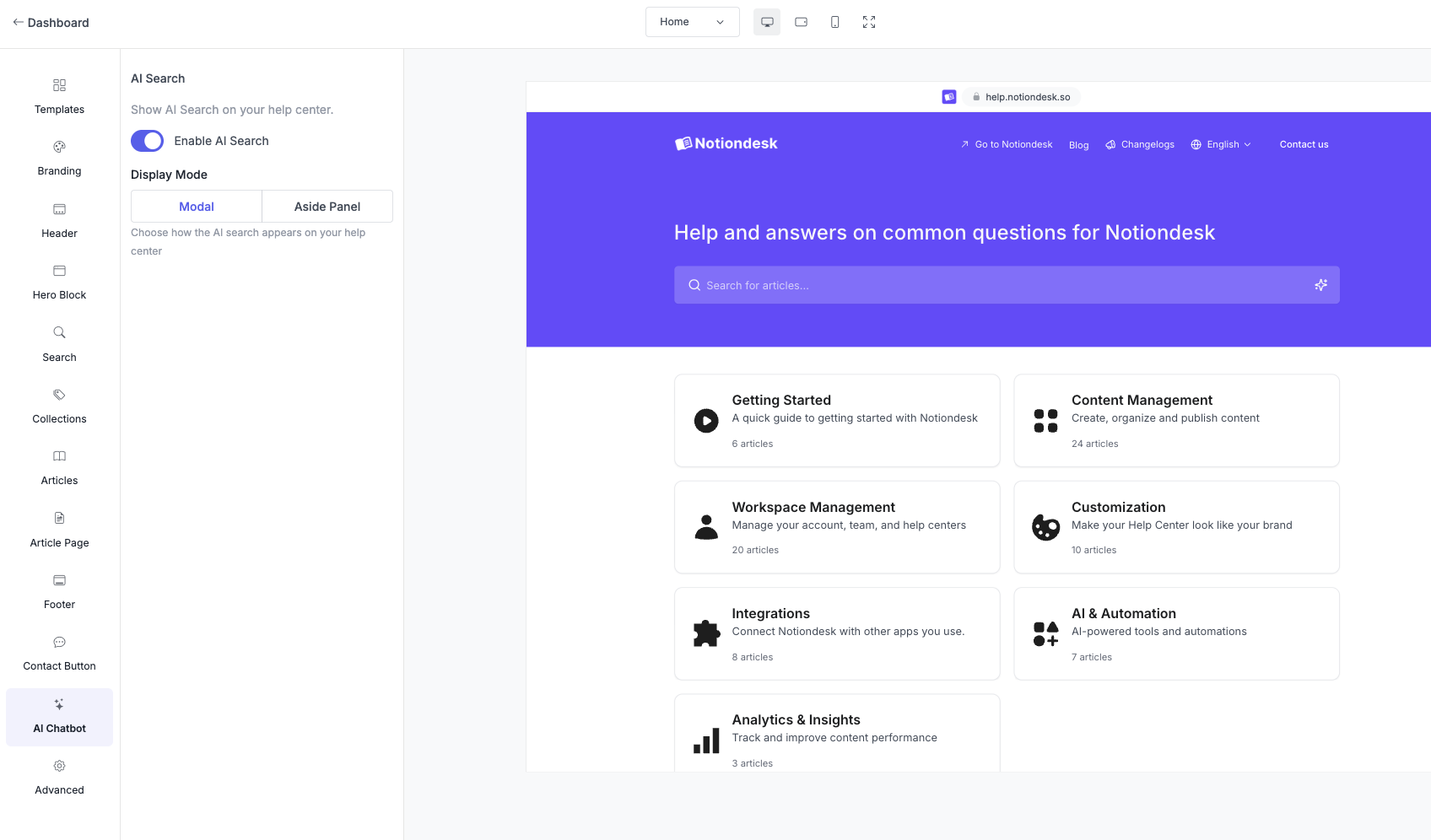 Control where and how AI Search appears when visitors ask questions on your help center. Choose between a modal overlay or a side panel, and position it to fit your layout.