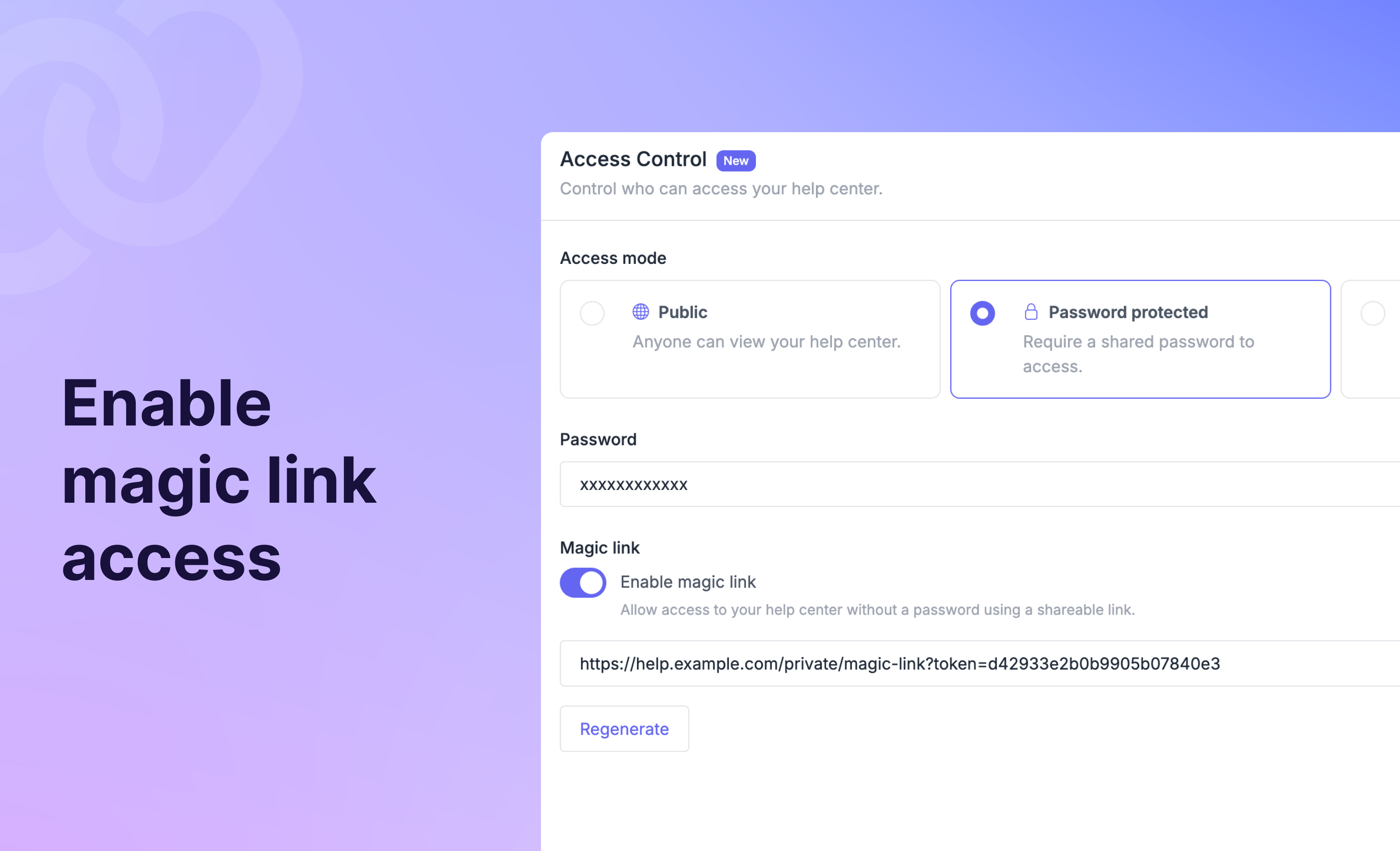 Activez le lien magique dans Réglages > Général, sous Contrôle d'accès. Vous obtiendrez une URL unique à partager avec les personnes autorisées. Les visiteurs cliqueront sur ce lien et accéderont directement à votre centre d'aide, sans avoir besoin de se connecter.