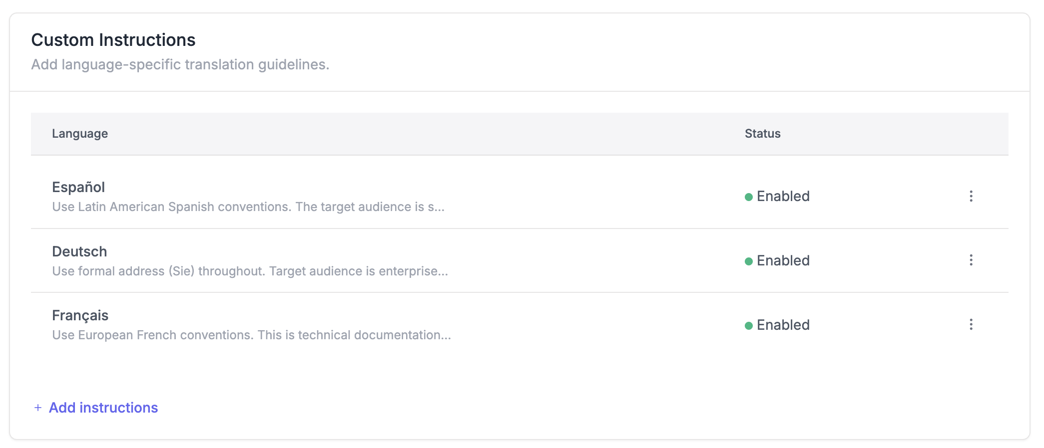 הוראות מותאמות אישית מאפשרות לך להוסיף הנחיות ספציפיות לשפה כדי לשלוט באופן שבו תרגום אוטומטי של בינה מלאכותית מטפל בתוכן שלך. תוכל לספק הקשר תרבותי, להסביר טרמינולוגיה בתעשייה או להגדיר העדפות אזוריות לכל שפה. זה עוזר להבטיח שהתרגומים האוטומטיים שלך ירגישו טבעיים ומתאימים לכל קהל, ללא צורך בעריכה ידנית.
