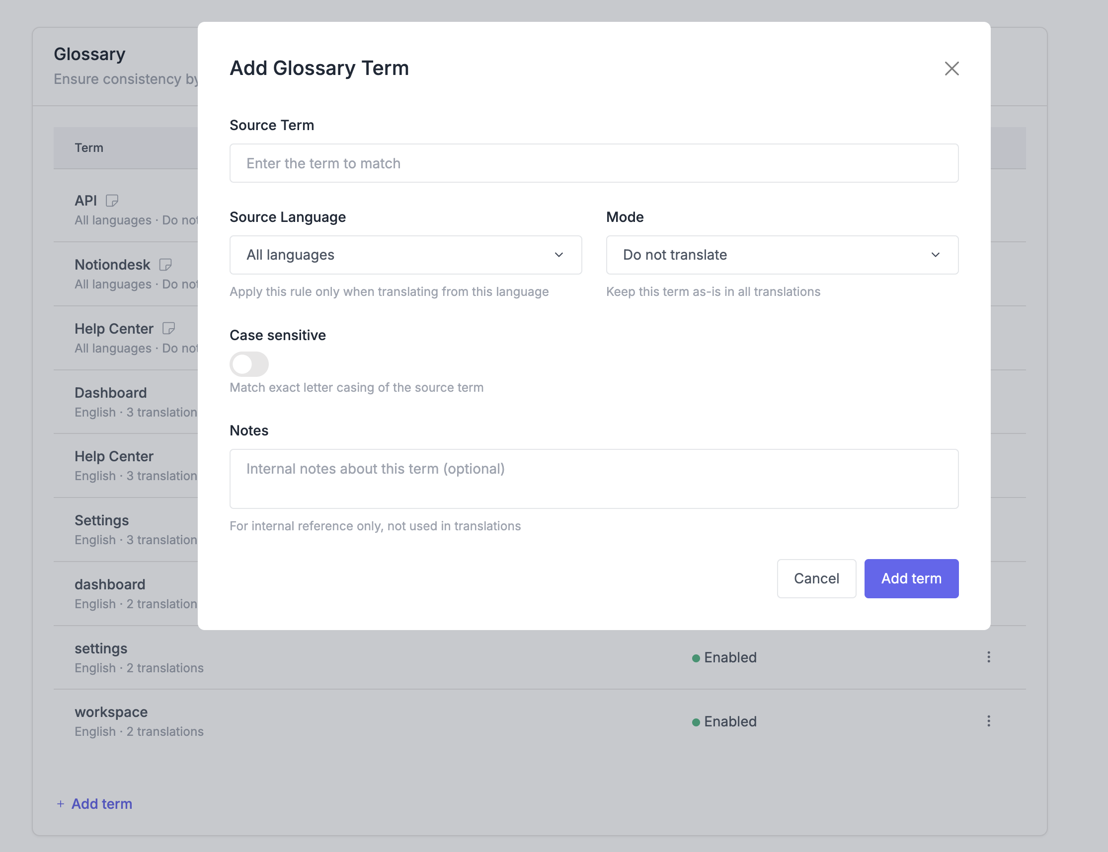 תרגומים כפויים מבטיחים שתרגום AI אוטומטי תמיד ישתמש בתרגום שציינת עבור מונח מסוים. אתה מגדיר בדיוק כיצד יש לתרגם מונח בכל שפה.