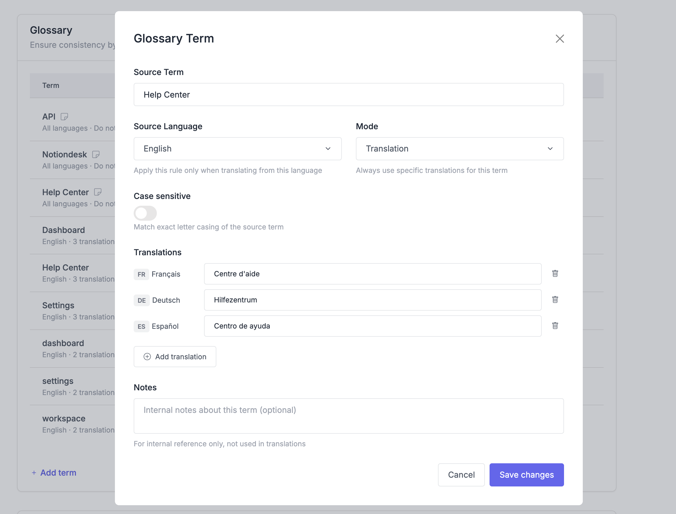 מילון התרגום מאפשר לך לשלוט באופן מדויק באופן שבו התרגום האוטומטי באמצעות בינה מלאכותית מטפל במונחים ספציפיים במרכז העזרה שלך. אתה יכול להגן על שמות מותגים, שמות מוצרים ומונחים טכניים מפני תרגום, או לכפות תרגומים ספציפיים עבור מונחים חשובים.
